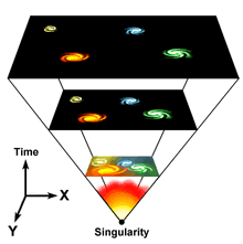 Edwin Hubble (1889-1953) was the first to realize that the fuzzy nebula that astronomers saw through their telescopes were in fact galaxies, like our own Milky Way. Each was composed of many millions of stars. These galaxies appeared to be moving away from one another. He concluded that at one point in the past, all of the matter and energy in the universe must have been concentrated in a single point. Based on this hypothesis, it is possible to estimate the age of the universe at 13.7 +/- 0.2 billion (109) years. This is a length of time well beyond human comprehension; it is sometimes referred to as deep time. |