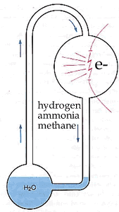 One approach to understanding what is involved in the origin of life is to attempt to create the precursors of living systems in the laboratory. An early and influential example of this approach was the Miller-Urey experiment. These two scientists made a guess as to the composition of earth's early atmosphere. They assumed the presence of oceans and lightning. They set up an apparatus to mimic these conditions. They passed electricity through their experimental atmosphere. After awhile (hours/days), they found that a complex mix of compounds had formed. Included in this mix were many different types of amino acids. |