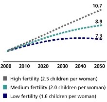 The human population is an interesting example of a system that has escaped one steady state and has yet to find another. This graph [←] displays three scenarios of human population growth, based on different levels of average fertility. In a number of countries, the birth rate already falls into the low fertility domain [link]. This decrease in birth rate per women correlates with reductions in infant mortality and increases in the educational level of women. The behavior of humans appears to be somewhat different from that of your "average" animal, plant, or microbe. |