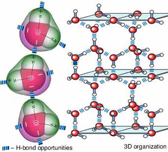 Because of this arrangement, each water molecule can interact through H-bonds with four other water molecules. To remove a molecule from its neighbors, four H-bonds must be broken.! In the liquid state, molecules jostle one another and change their H-bonded interaction partners constantly. Yet, each water molecule remains linked to multiple neighbors via H-bonds. This molecular hand-holding leads to water's high melting and boiling points as well as its high surface tension. |