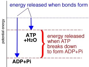 There are a number of ways that cells store energy. The synthesis of ATP from adenosine diphosphate ADP and inorganic phosphate (Pi) is the most familiar. As you (hopefully) appreciate, whenever a bond is formed, energy is released - it always takes energy to break a bond |
