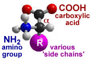 After an analysis of a number of different substances, he proposed that they all represented versions of a common chemical core, with the molecular formula: C400H620N100O120P1S1. Proteins can act as catalysts (enzymes) and regulators of chemical reactions - we have already seen how proteins act to regulate transport across membranes. Proteins control the expression of genes, how genes respond to internal and external signals, and the replication of the genetic material. Proteins can act as structural components, determining both the shape and mechanical properties of cells and tissues. They can be motors, responsible for movements within cells and the movement of cells, tissues and the organism as a whole. Mulder was able to break down a number of proteins through an acid hydrolysis reaction into amino acids, named because they contained amino (-NH2) and carboxylic acid (COOH) groups. Twenty different amino acids could be identified in hydrolyzed samples of proteins. |