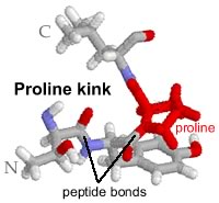The carbonyl oxygen (-C=O) acts as a H-bond acceptor, while the amino hydrogen (-N-H) acts as a H-bond donor. There is no H-bond donor in the proline peptide bond and the presence of proline leads to a bend or kink in the polypeptide chain. |