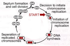 Bacterial cell cycles: The replication of a cell, or an organism, can be thought of as a cycle. Somewhat arbitrarily, we place the beginning of this cycle with the decision to replicate the genetic material, the DNA. This is a critical decision for the cell. DNA replication involves the unwinding of the DNA and a set of highly interdependent and coordinated processes. Consider the following catastrophic scenario. A cell begins replicating its DNA, but before it completes the process it runs out of resources -- ATP levels fall and the other deoxyribonucleotide triphosphates needed to synthesize DNA are in short supply. Under these conditions replication forks will stop and the DNA will be left unwound and incompletely replicated. This is a situation that is likely to lead to DNA damage. |