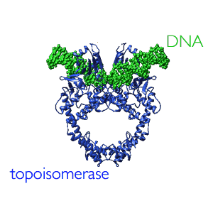 The two replication forks move away from one another and around the chromosome. The forks collide in the region of the chromosome known as the terminator region or "ter". At the end of replication, two sister chromosomes are entangled with one another, they are concatenated. They are untangled by the enzyme, DNA topoisomerase II, which can pass one double-stranded DNA molecule through another. |