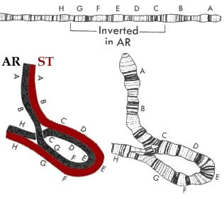 Occasional mutations will flip a stretch of DNA within a chromosome, producing an chromosomal inversion. Sometimes, a chromosome may break and then be rejoined incorrectly to another chromosome – this is known as a chromosomal translocation. Such chromosomal rearrangements complicate synapsis and can lead to a failure of meiosis, and hence sterility. The accumulation of chromosomal rearrangements is one mechanism use to establish reproductive isolation during the formation of new species. |