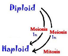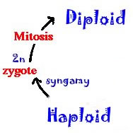 Syngamy, which is also known as fertilization, mediates the transition from haploid to diploid. During syngamy, two haploid cells fuse. Cell fusion is followed by nuclear fusion, leading to the formation of a diploid cell. This diploid cell has two sets of chromosomes and so is 2N. A number of plants, such as the mosses, spend a significant amount of their organismic life cycle in the haploid state. During this haploid phase, the organisms are known as gametophytes. |