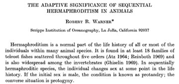| Sexual identity is not necessarily fixed. There are also organisms that can change sex over time, these are known as sequential hermaphrodites. (short video). In a number of fishes, for example, sexual identity can be influenced by social interactions. In the absence of a male, the largest (dominant) female will become male, making sperm rather than eggs. This is a trait that has originated independently, multiple times |