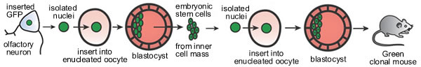 Since then many different species of mammal have been cloned, and there is serious debate about the cloning of humans. In 2004, cloned mice were derived from the nuclei of olfactory neurons using a method similar to that used by Gurdon. These neurons were derived from a genetically engineered mouse that expressed green fluorescent protein (GFP - the gene was isolated from the jellyfish Aequorea victoria). A hybrid gene