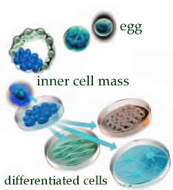 Embryonic stem cells can be cultured in vitro; under certain conditions they can be induced to differentiate into various cell types. Since the generation of totipotent human embryonic stem cells involves the destruction of a human embryo, it raises a number of ethical issues as well as technical problems. More recently, there have been a number of reports that differentiated cells from adults can be "reprogrammed" by the introduction of various actively expressed genes (and other methods), to form cells that behave much like embryonic stem cells. (references here, here and here). |
