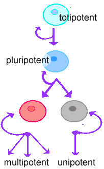 As the zygote divides, the cells it differentiates into form the many different cell types of the fetus and eventually the adult: skin, muscle, nerve, hair, bone, etc. The process of differentiation proceeds in a stepwise fashion and involves changes in gene expression. It is easy to tell a muscle cell from a neuron from a bone cell from a skin cell by the set of genes they express, the proteins they contain, their shape (morphology), their internal organization, and their behavior. The zygote created by fertilization is totipotent, it can generate all of the cells of the adult. As development proceeds, however, cells become more and more restricted with respect to the types of cells that they can produce -- they become committed to one or another specific fate. |