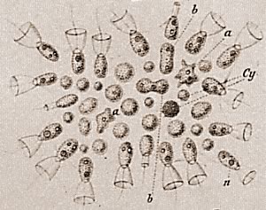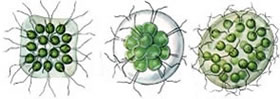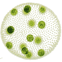 Alternatively, the cells can be more regularly organized, as in a Volvox. Volvox can reproduce asexually, by forming daughter colonies that develop within the mother. There is also a sexual cycle, mediated by the formation and fusion of gametes. These colonial organisms appear closely related to higher plants or metaphyta. |