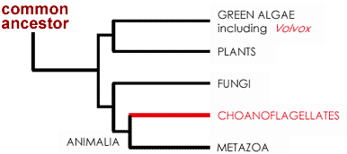 The animals or metazoa appear to have been derived from a different eukaryotic lineage. Their sister group (that is their closest unicellular relatives) appears to be the choanoflagellates. |