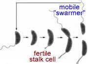 An early step on the path to true organismic multicellularity is the development of different cell types of the same organism. One example of multiple cell types is found in the bacteria Caulobacter crescentus. Under certain conditions it will produce stalk cells, that attached to a surface, and swimming cells that can migrate away and colonize new surfaces. In a sense, the stalk cell is sacrificing itself to form a swarming cell, that has a better chance at survival. |