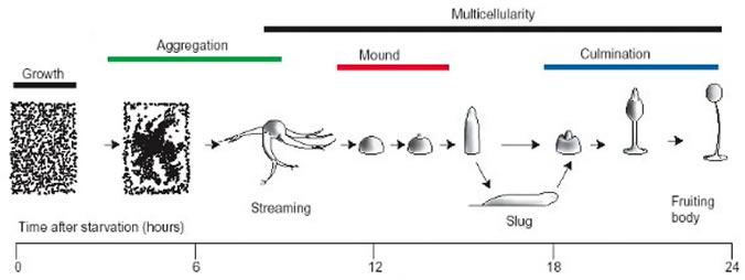 How is the "self-sacrificing" behavior of the stalk cells possible? The answer lies in inclusive fitness. The purpose of the slug and stalk are to enable Dictyostelium cells to escape a hostile environment and colonize new, hopefully more hospitable environments. Since Dictyostelium cells do not migrate far, most of the cells in any particular region, that is the cells that combine to form a slug, are likely to be closely related to one another - they are part of a clone. The sacrifice of stalk cells is more than made up for by the increased chance that the spore cells will survive and prosper, that is, from an evolutionary perspective, have lots of offspring. Of course there is a danger that some cells have diverged (through mutation), and will try to cheat, that is, avoid becoming stalk cells. Such cheating has been observed in wild type Dictyostelium [link][link], and cheating is a challenged faced by all multicellular systems. We deal with it more in the next reading. |