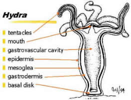 The next level of metazoan complexity is represented by hydra and related organisms, the hydrozoa, which include the jellyfish. Some of these organisms alternate between a sessile and benthic or floating lifestyle. They can swim and can move in subtle ways. |