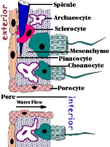 Sponges (porifera) are among the simplest of the metazoans. They contain only a few different types of cells. These include